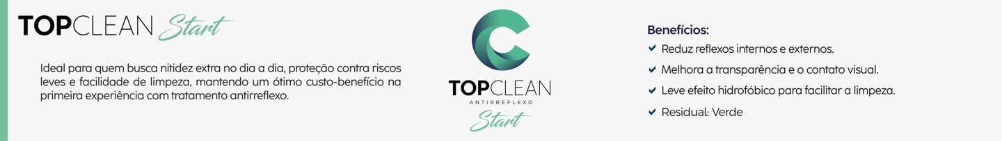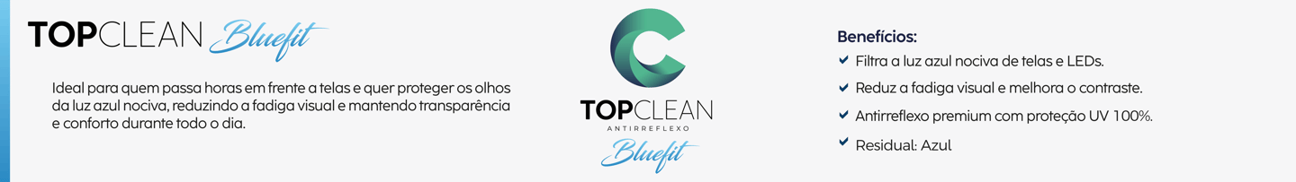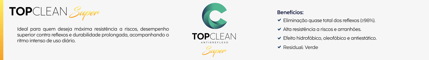 Com a linha de antirreflexos TOPCLEAN da Centerlab, suas lentes passam por um tratamento premium que reduz reflexos, protege sua visão e valoriza seu olhar.